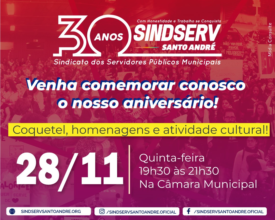 Nesta quinta-feira (28), a partir das 19h30, o Sindserv Santo André vai realizar na Câmara Municipauma homenagem aos seus 30 anos de lutas e conquistas.