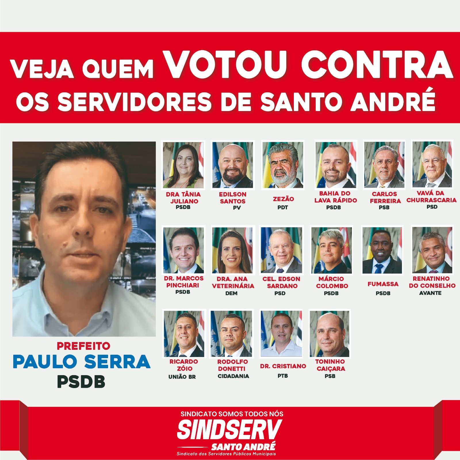 A Diretoria do Sindserv Santo André reforça sua indignação com essa postura arbitrária e desrespeitosa do prefeito Paulo Serra que, mais uma vez, passou seu projeto de lei sem dialogar com o Sindicato e com os servidores públicos, e convoca todos para participarem das ações do Sindicato nas redes sociais e nas ruas.