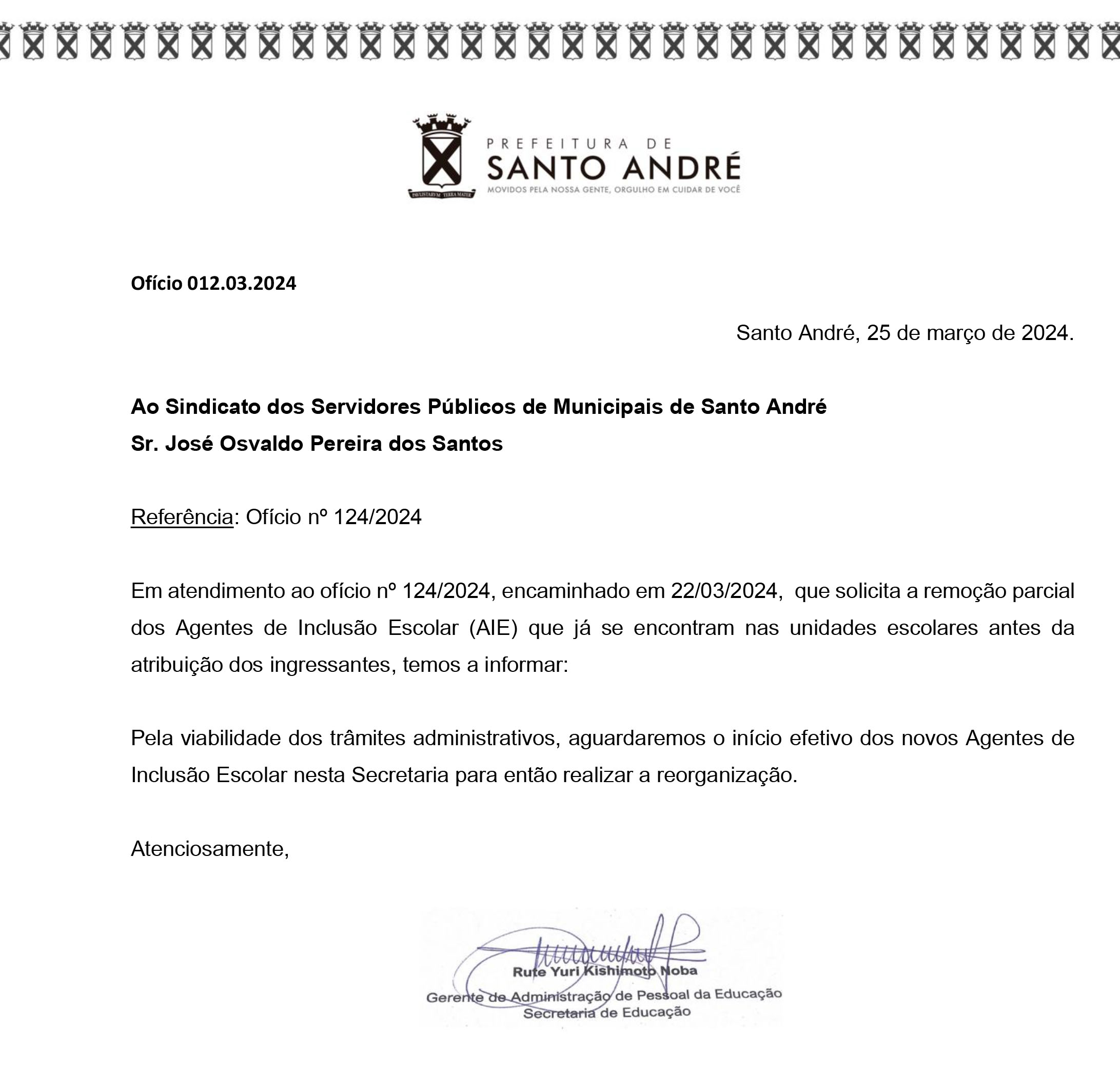 A pedido dos Agentes de Inclusão Escolar (AIE), o Sindserv Santo André enviou no último dia (22) ofício à Secretaria de Educação solicitando que seja realizada a remoção parcial dos trabalhadores para unidades escolares mais próximas de suas localidades.
