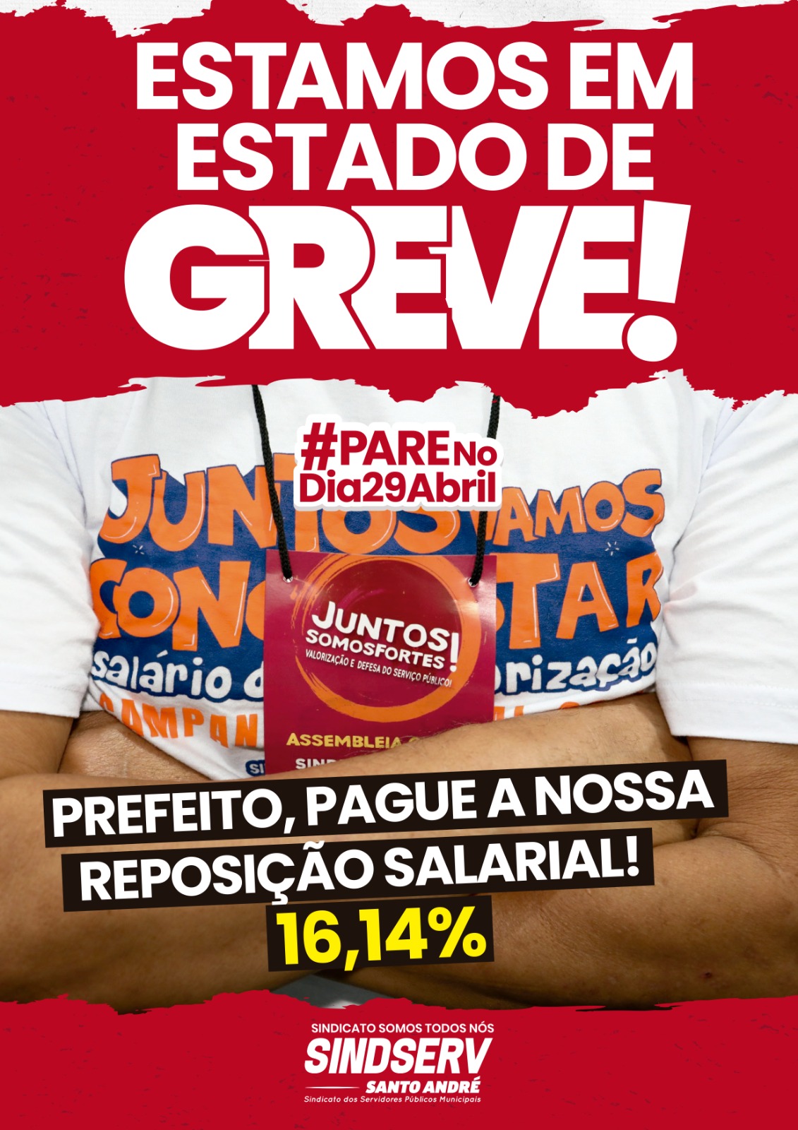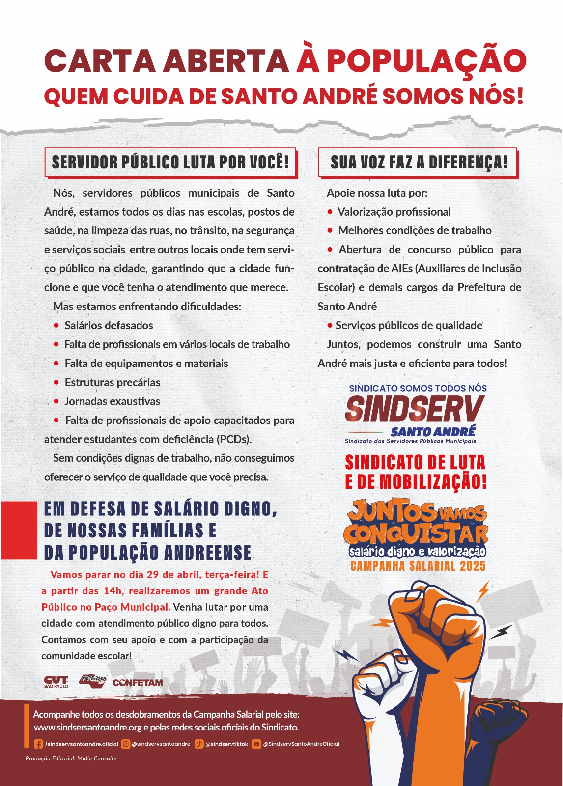 A diretoria do Sindserv Santo André está percorrendo as unidades escolares, UPAs, refeitórios da CRAISA, FACON, Betânia e SOSP para convocar os servidores para aderirem à paralisação do dia 29 de abril. Eles estão distribuindo os informativos: "Carta Aberta à População: Quem cuida de Santo André somos nós" e sobre a decisão da Assembleia da Campanha Salarial.
