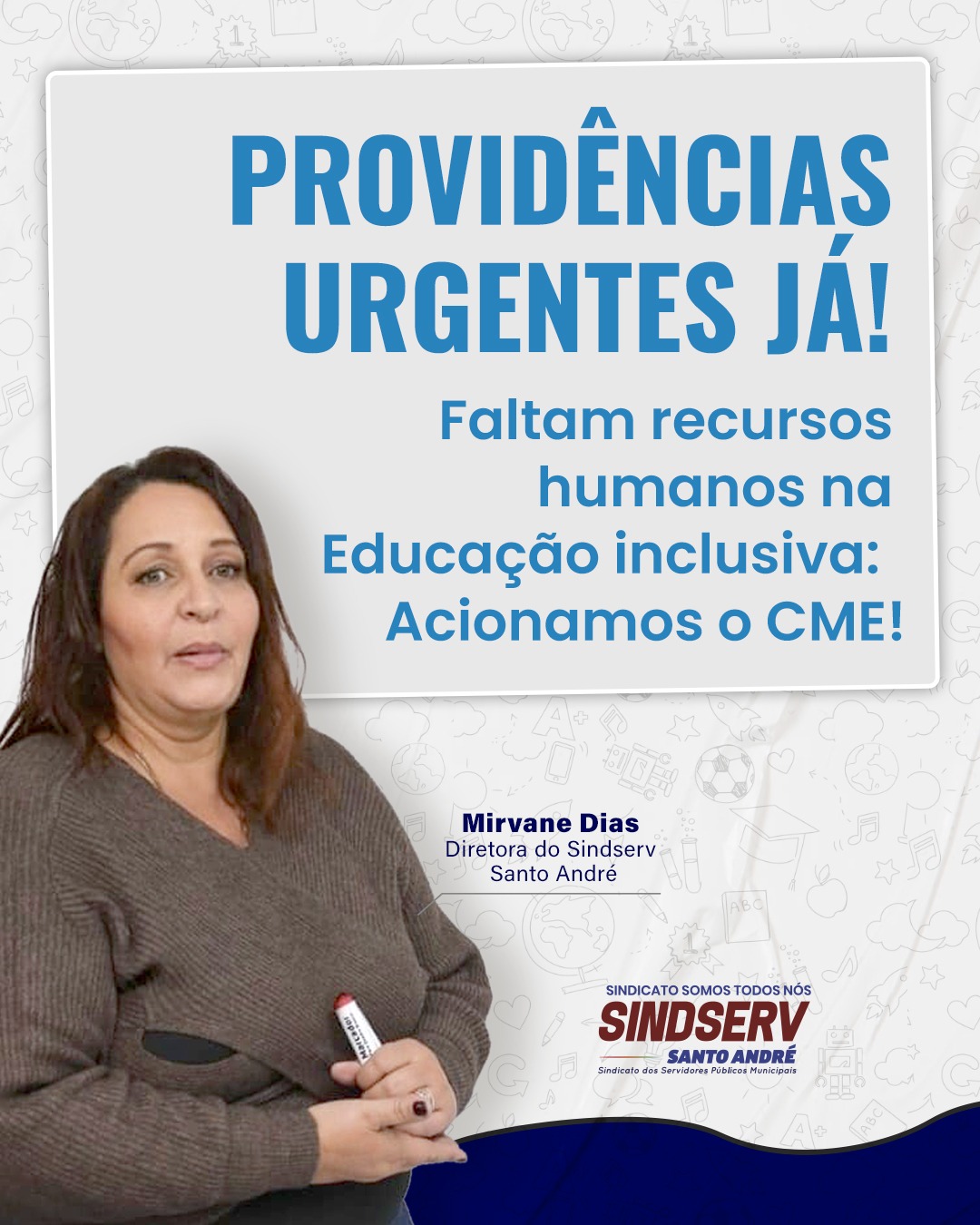 O Sindserv Santo André solicitou ao CME (Conselho Municipal de Educação) que paute, em sua próxima reunião no dia 1º de outubro, providências urgentes da Secretaria de Educação sobre o grave problema enfrentado pelos profissionais da rede em relação à falta de recursos humanos para o atendimento da educação inclusiva.