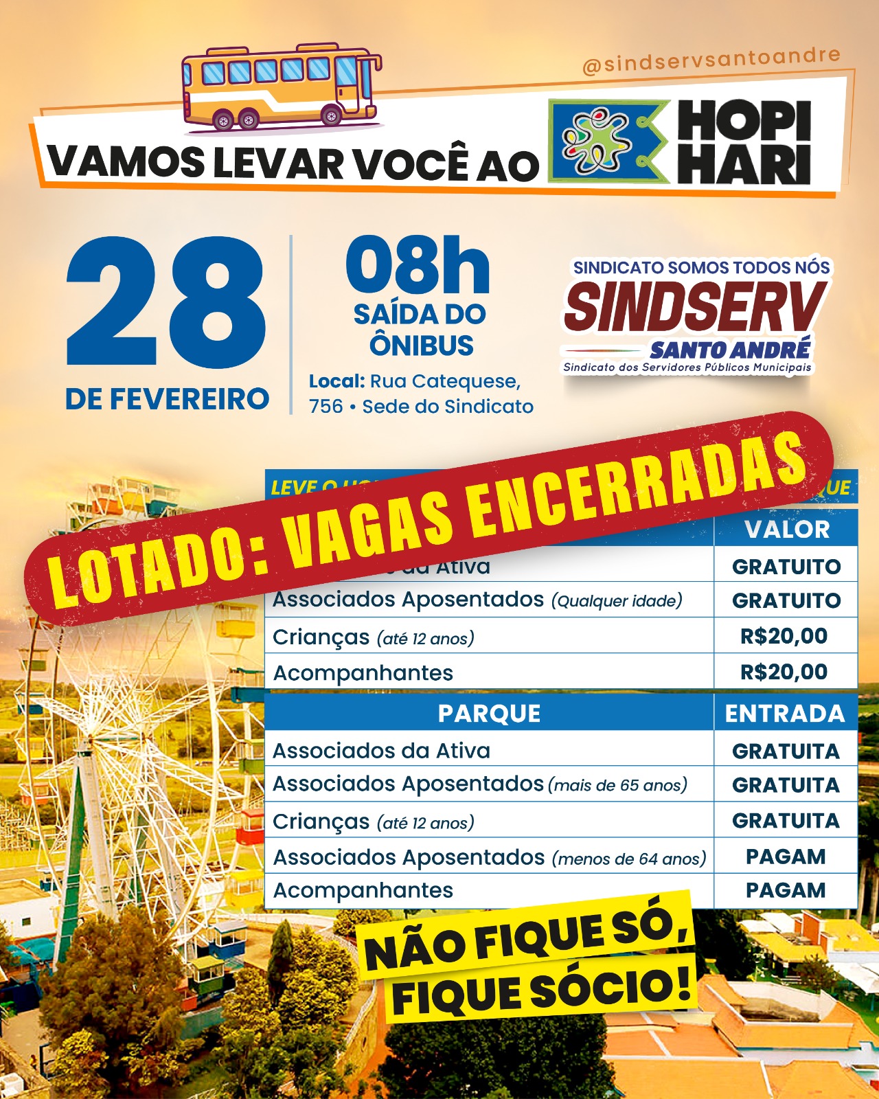 As vagas para a excursão ao Hopi Hari, promovida pelo Sindserv Santo André, estão esgotadas. No total, são dois ônibus.A diretoria do Sindicato agradece a participação das servidoras e servidores da ativa e aposentados associados que irão, junto com seus acompanhantes e filhos, no ônibus no dia 28 de fevereiro (sábado), com saída às 8h, em frente à sede social, localizada na Rua Catequese, 756, em Santo André.