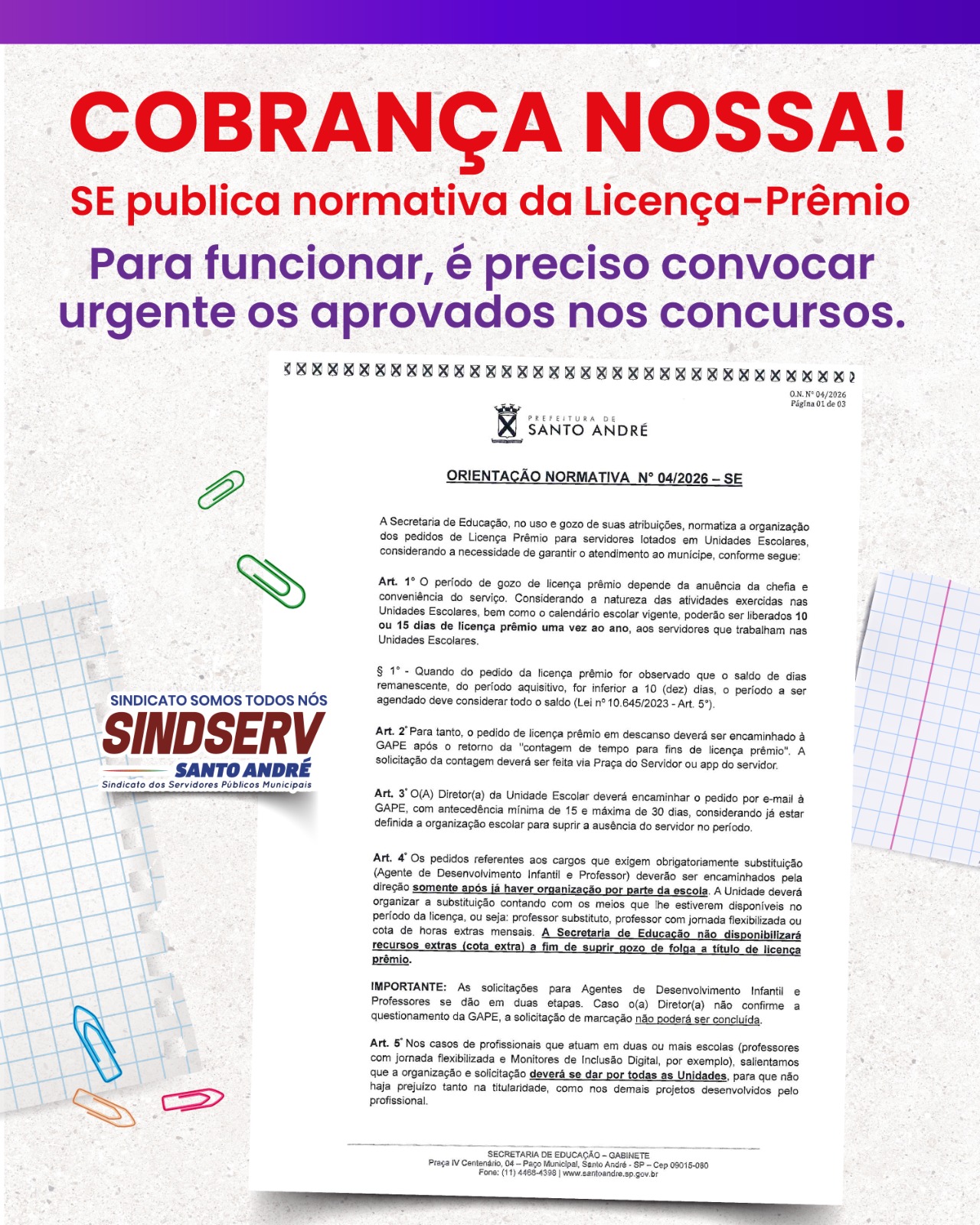 Após cobrança do Sindserv Santo André, a Secretaria de Educação (SE) publicou na última sexta-feira, dia (27), a Orientação Normativa nº 04/2026, que estabelece regras para a organização e concessão da licença-prêmio aos profissionais da Educação da rede.