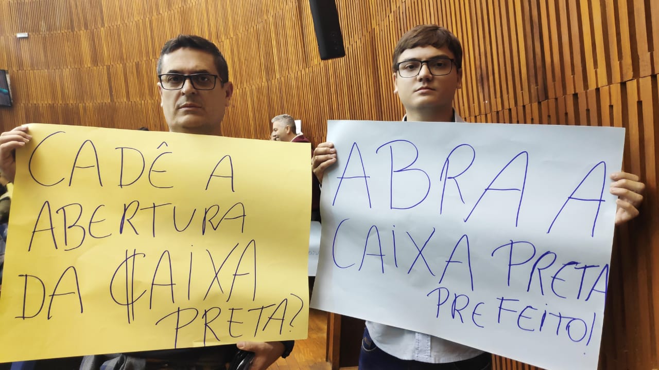 Os diretores Pedro e Rodrigo Gomes no protesto que lotou a Câmara Municipal no dia 7 de maio - foto: Viviane Barbosa/Mídia Consulte