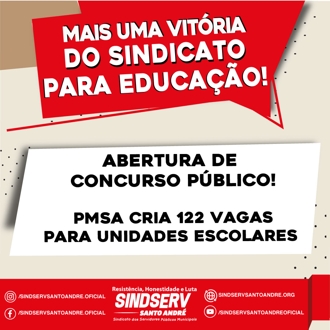 A defesa da abertura de mais concursos públicos na cidade de Santo André é uma luta permanente da Diretoria do Sindserv Santo André . O trabalho sério e dedicado da nossa Direção tem alcançado esse resultado: a PMSA anunciou a abertura de 122 vagas para profissionais da Educação.