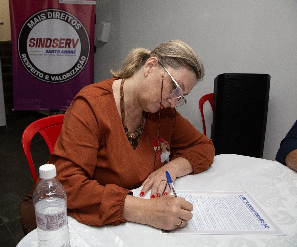 A candidata do PT defendeu a valorização dos servidores, com um programa de formação e requalificação, propôs a criação de um plano de carreira para todos os servidores da ativa e a criação de um Comitê com a participação do Sindserv Santo André para debater esses temas.