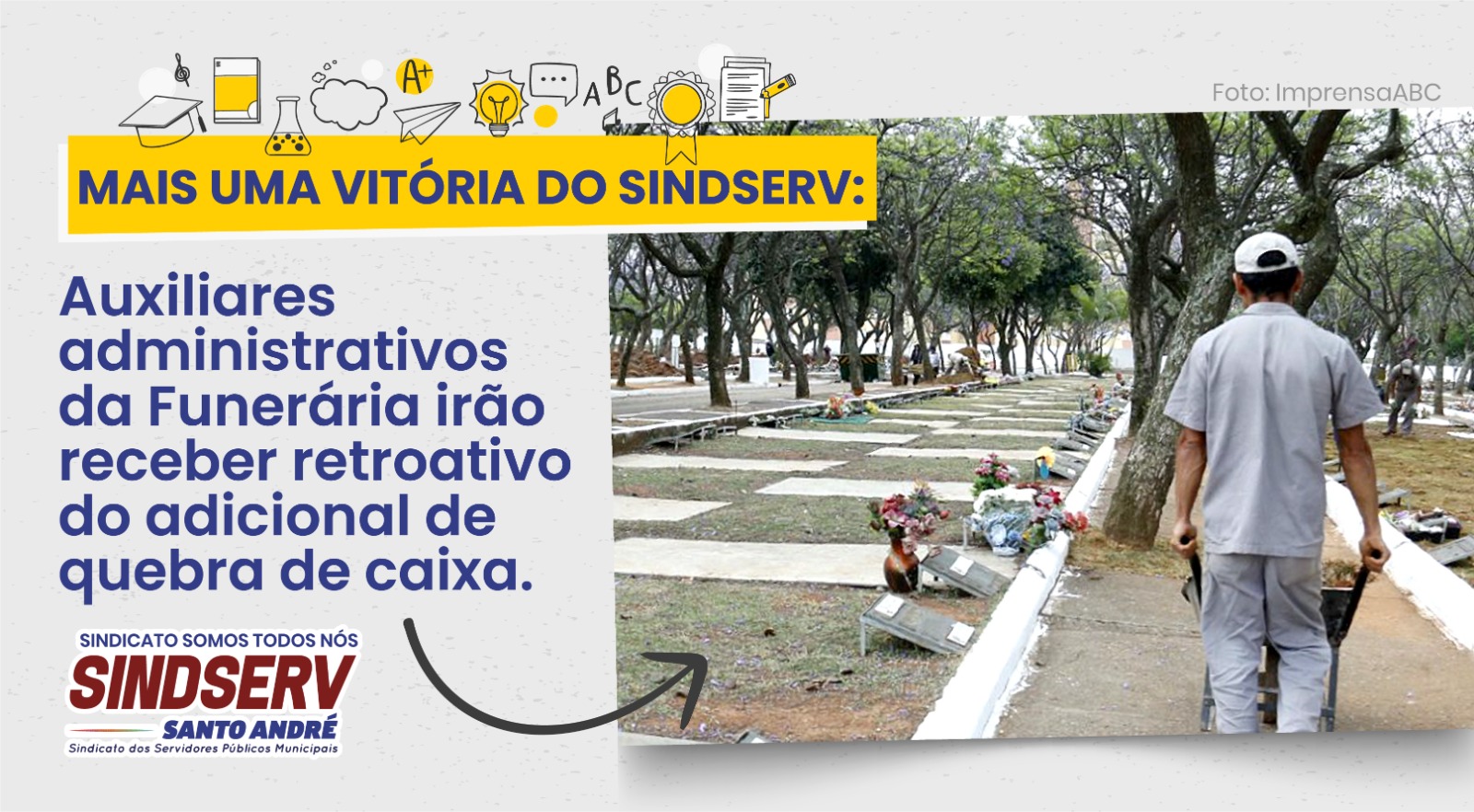 Os servidores auxiliares administrativos associados do Serviço Funerário Municipal de Santo André que procuraram o Sindicato irão receber o retroativo do adicional de quebra de caixa. Esse direito é assegurado aos trabalhadores que trabalham nos cemitérios com dinheiro em espécie no atendimento ao público.