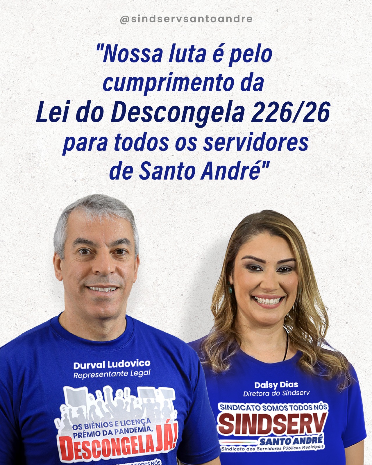 A recente lei federal sobre o Descongela Já dos biênios e da licença-prêmio (Lei Complementar nº 226/2026), sancionada pelo presidente Lula e de autoria da deputada federal, professora Luciene Cavalcante, representa uma grande vitória em defesa da valorização de todos os servidores e servidoras andreenses que não pararam de trabalhar durante pandemia de COVID-19.